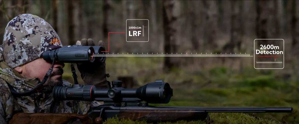 O LRF oculto com alcance até 1000 m projeta a distância diretamente no visor, permitindo medições únicas ou contínuas para cálculo de balística e marcação de pontos de interesse — reduzindo a necessidade de dispositivos externos e acelerando decisões em campo.
